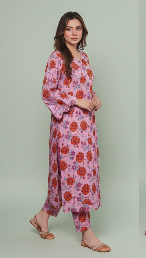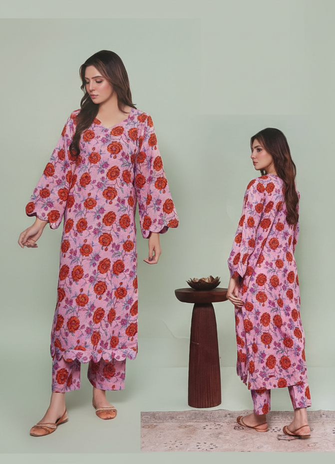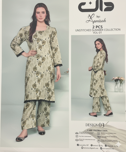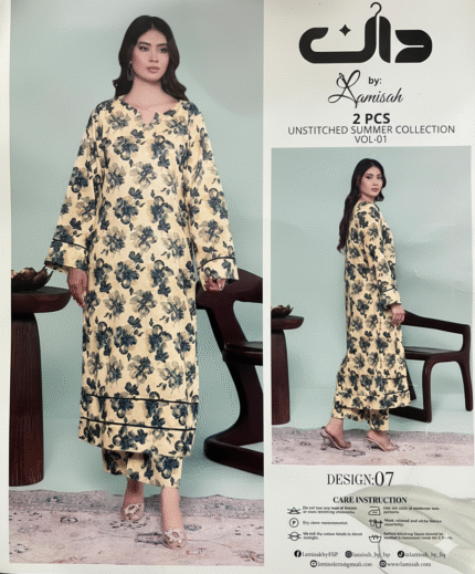 Dan by Lamisch ka yeh premium 2-piece unstitched lawn suit summer ke liye ek perfect choice hai. Soft breathable fabric, elegant floral print aur stylish cut isay har roz ke wear ko bhi classy bana deta hai. Light-weight texture aur soothing colors aap ko poora din cool, fresh aur comfortable feel karwate hain. Yeh suit easy-to-stitch hai aur har body type par khubsurti se fit hota hai—daily wear ho ya casual outing, dono ke liye ideal.